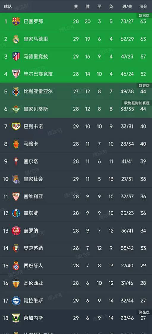 北京时间3月30日,西甲第29轮迎来了4场激烈的比赛。在其中,皇家马德里勉强以3-2力克莱加内斯,马德里竞技则与西班牙人打成1-1平局,阿拉维斯则以0-2不敌巴列卡诺,而皇家社会则以2-1战胜巴拉多利德。现在让我们一起看看最新的西甲积分榜上有哪些变化吧!
